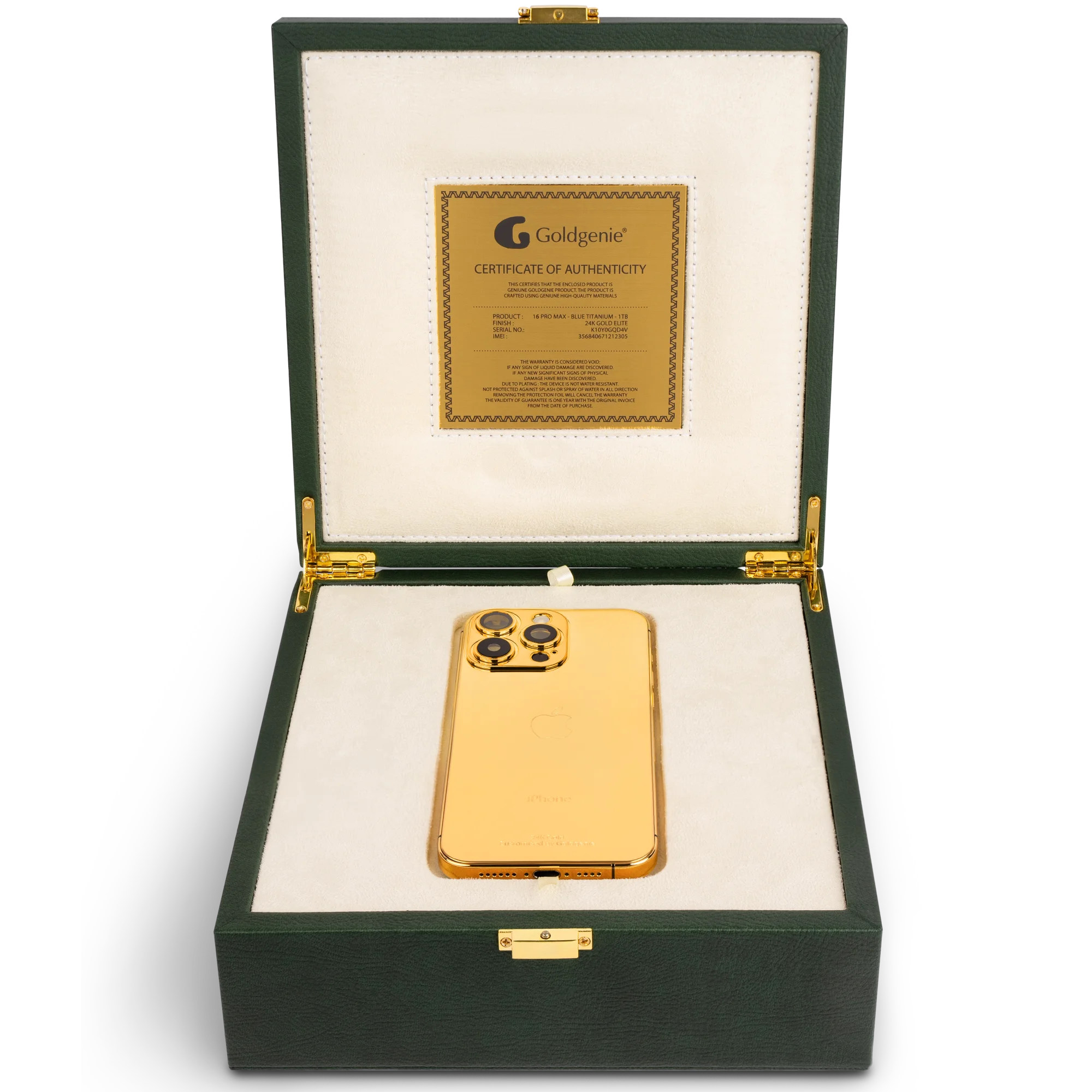 The Luxury 24k Gold iPhone 16 Pro/Pro Max (Limited Edition) stands as a masterpiece of craftsmanship and exclusivity. Customized by the renowned artisans at Goldgenie, this device is wrapped in genuine 24k gold. Transforming Apple’s latest iPhone model into a luxurious statement piece. Every detail has been meticulously crafted, with 5 microns of pure 24k gold added to the iPhone’s sleek exterior, ensuring a flawless, radiant finish.